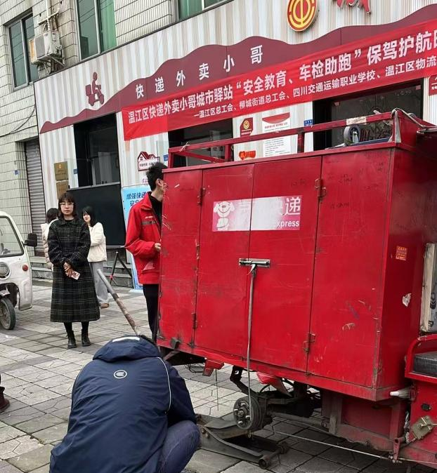 为全面提高温江区快递、外卖行业从业人员的交通安全意识、法制意识和文明意识,预防和减少交通事故的发生,切实做好新就业形态从业群体关心关爱工作,3月12日,学校联合温江区总工会、柳城街道总工会,对辖区内快递外卖小哥开展“安全教育、车检助跑”保驾护航“暖新”活动,此次“暖新”活动,邀请专业维修师傅免费为辛勤奔波在城市中的快递员、外卖骑手提供车辆检修,并开展了交通安全警示教育。