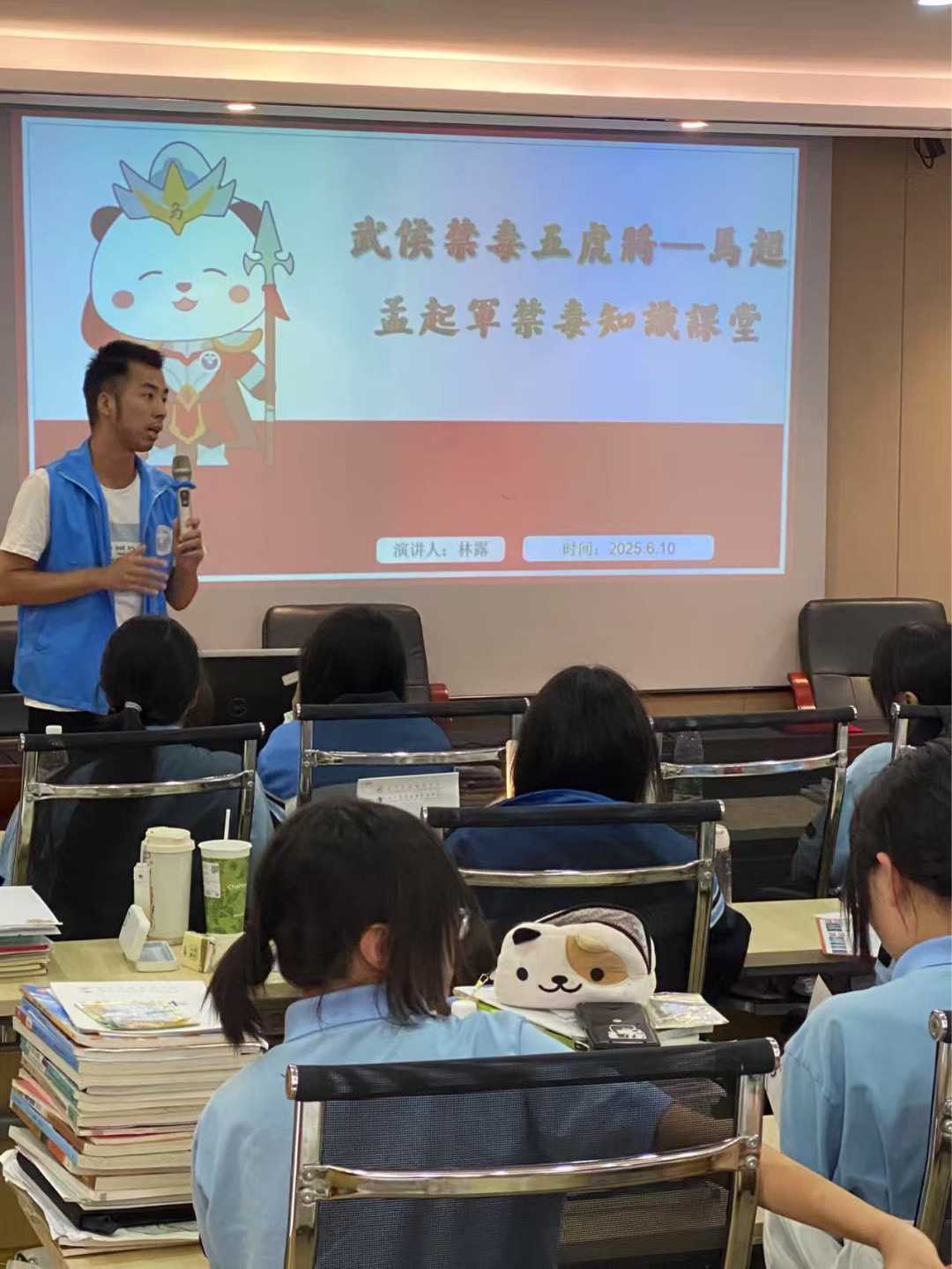 为增强青少年识毒、防毒、拒毒意识,近日,我校联合武侯区红牌楼街道禁毒办开展“禁毒宣传进校园”主题教育活动,为大家开设了一次武侯区禁毒办以三国文化为背景打造出的武侯专属“武侯禁毒五虎将——马超·孟起军禁毒知识课堂”,40余名师生代表参与。
