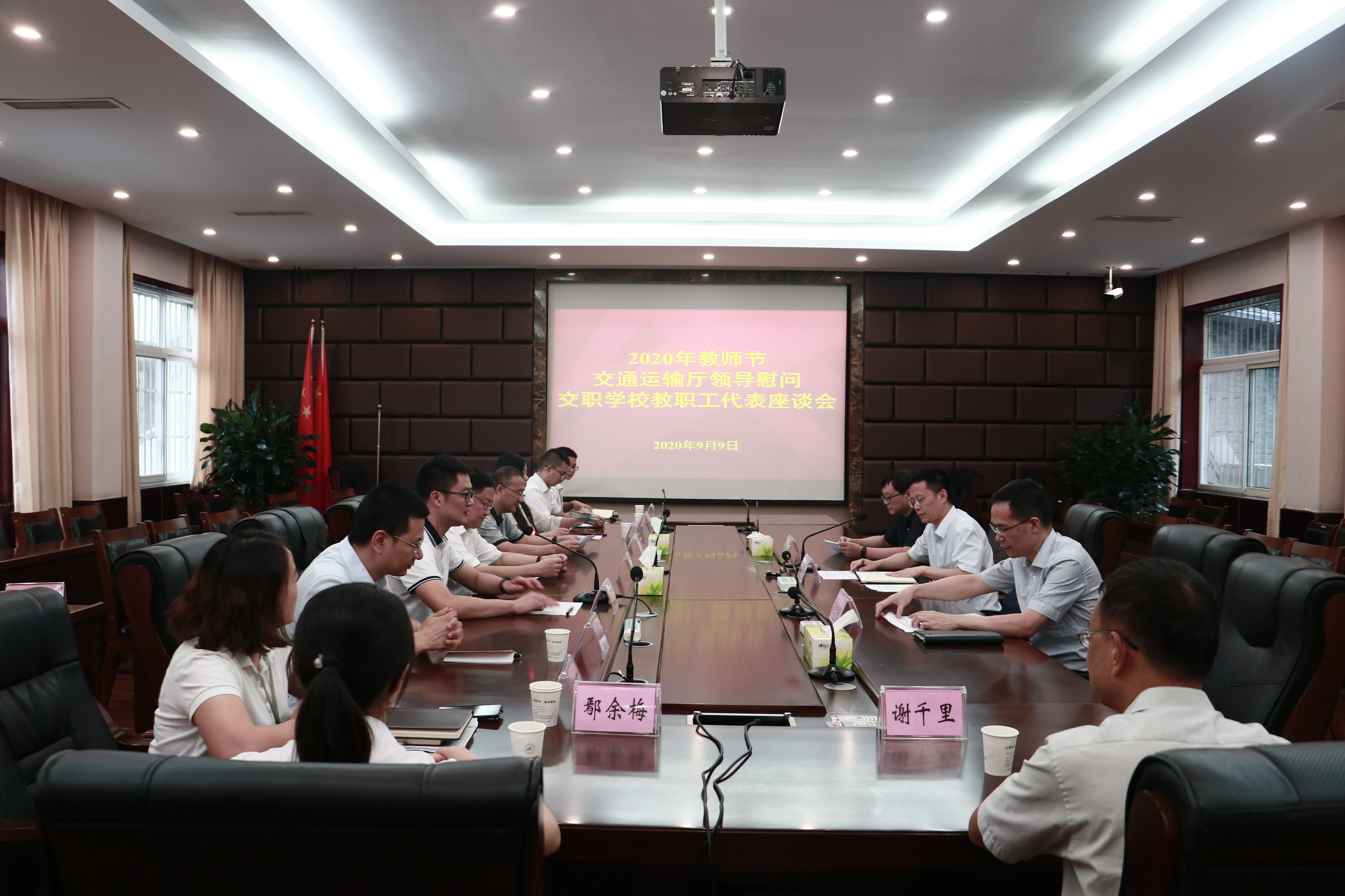 9月9日,省交通运输厅党组成员、厅直属机关党委书记胡洪波一行来校慰问教师代表,并与教师代表座谈。会上,厅人教处处长冯书明宣读了厅党组致全省交通运输系统广大教师的慰问信,学校教师冯倩、黄靖淋代表全体老师发言,感谢厅领导心系学校发展,关心教师成长,并汇报了近期的工作情况和下一步的工作打算。