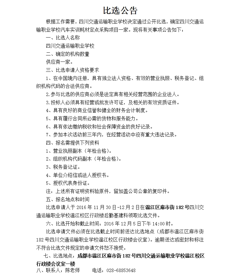 四川交通运输职业学校汽车实训耗材定点采购项目比选公告-四川交通运输职业学校-官方网站