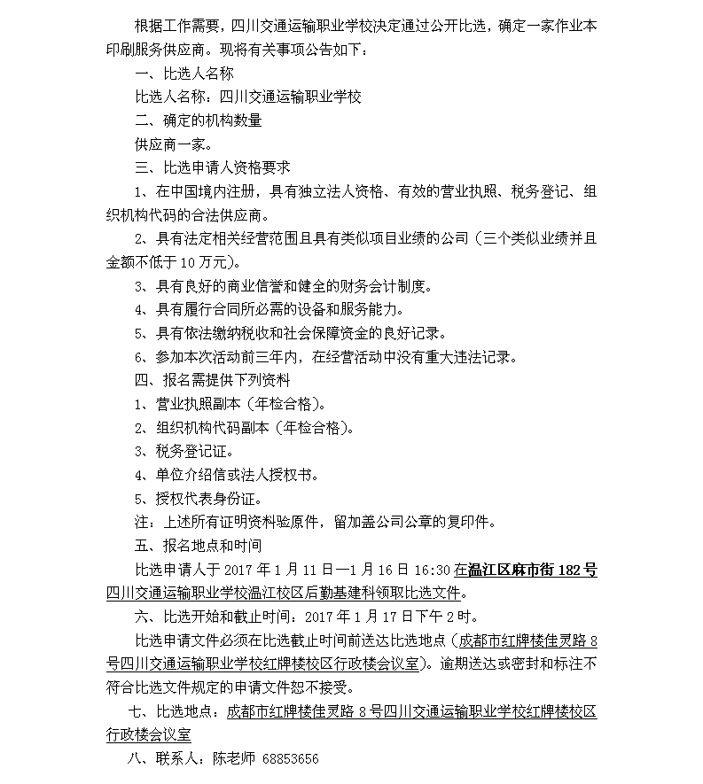四川交通运输职业学校作业本印刷比选公告-四川交通运输职业学校-官方网站