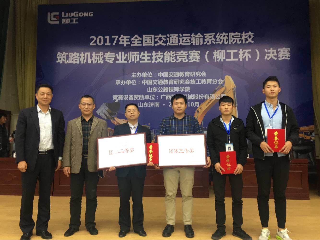 2017年10月25日,在副校长龚文安的带领下,裁判员周永春、参赛队员谢河斌老师、谢志强老师、杨旭权及罗应奎四人到山东参加全国交通系统院校筑路机械专业师生竞赛(柳工杯)决赛。经过26日、27日两天紧张的比赛,我校荣获教师团体三等奖、学生团体二等奖;学生单人二等奖和单人三等奖。